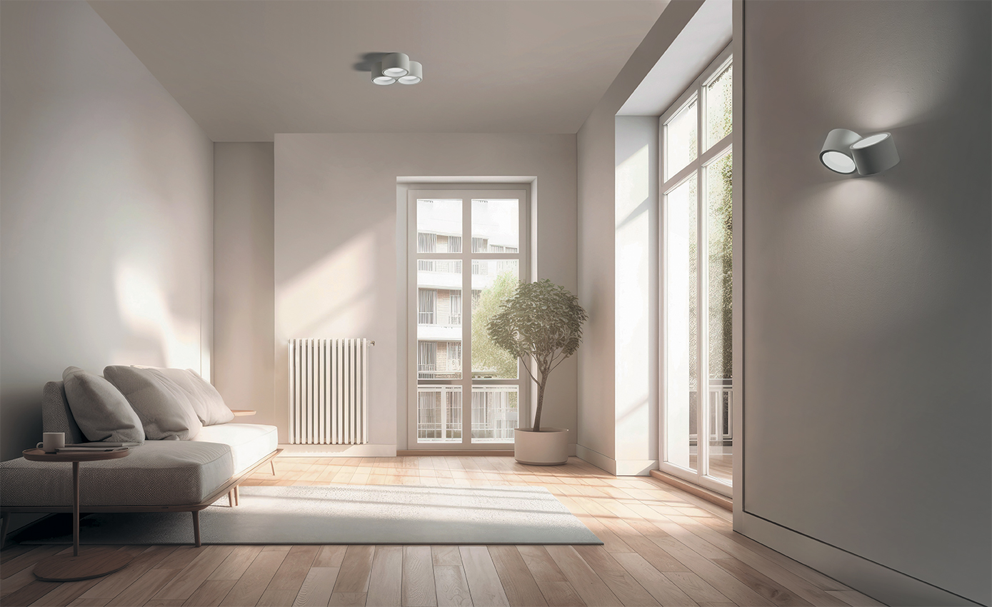 Wandleuchte aus Gips für indirekte Beleuchtung. Mattweiß lackierte Aluminiumringe. Ausgestattet mit zwei GX53-Lampenfassungen