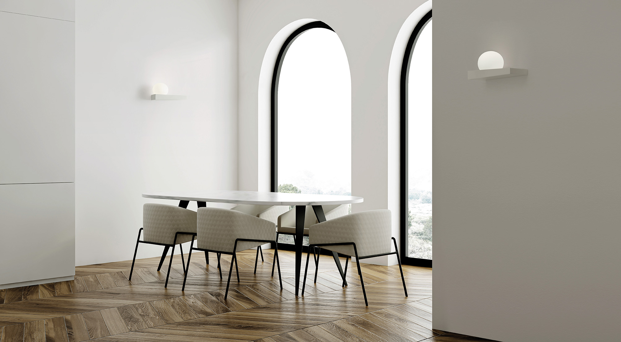 Plaster wall lamp with round blown glass. Equipped with GX53 lamp holder.