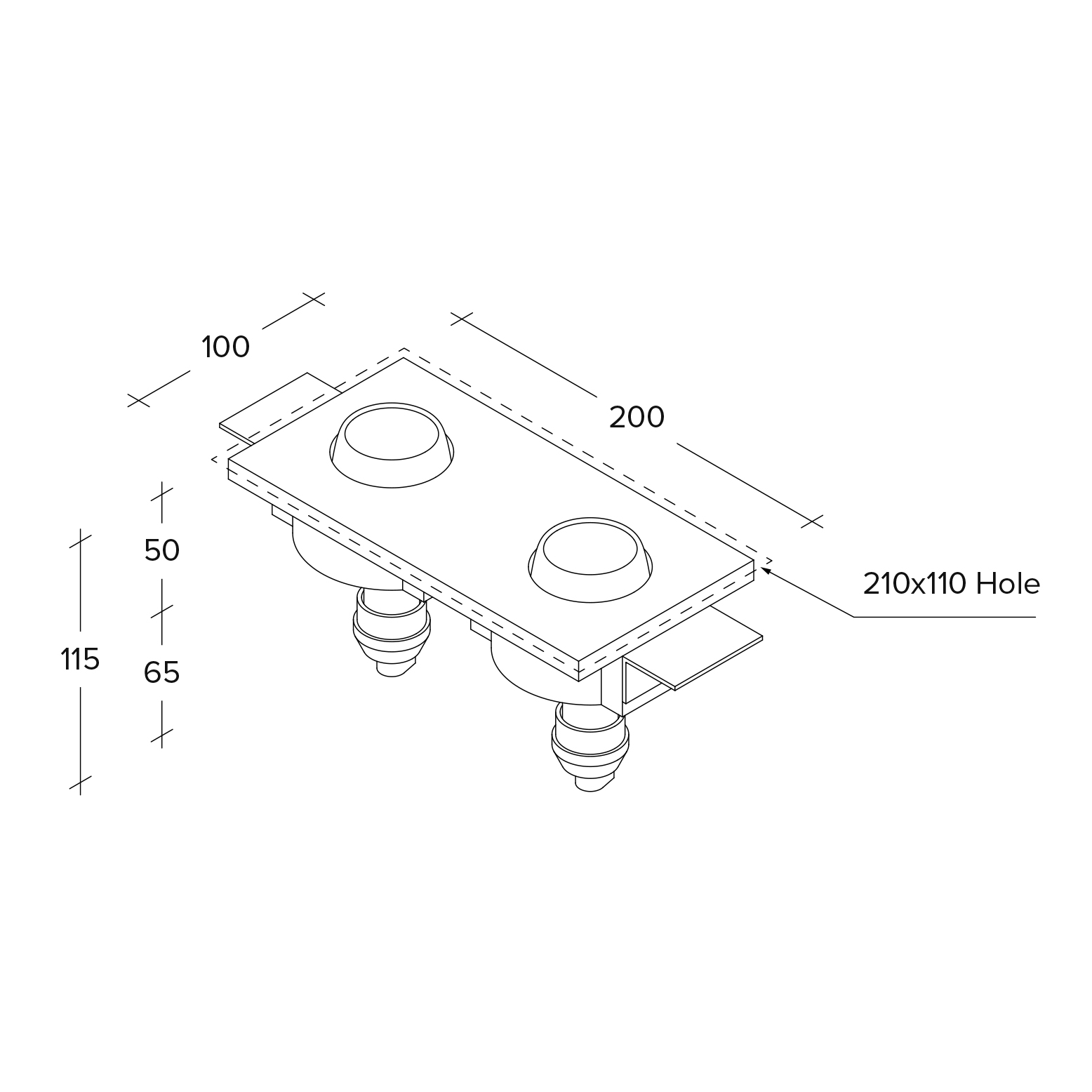 Recessed plaster spotlight with matt white metal rings. Adjustable 15° tilting lights. 2 x GU10 lamp holders. After smoothing it out, the spotlight – which can be installed in plasterboard – becomes one with the structure.