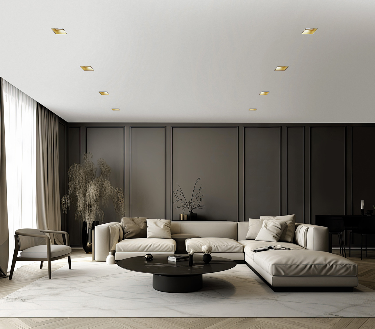 Recessed plaster spotlight with brass metal element. GU10 lamp holder. After smoothing it out, the spotlight – which can be installed in plasterboard – becomes one with the structure.