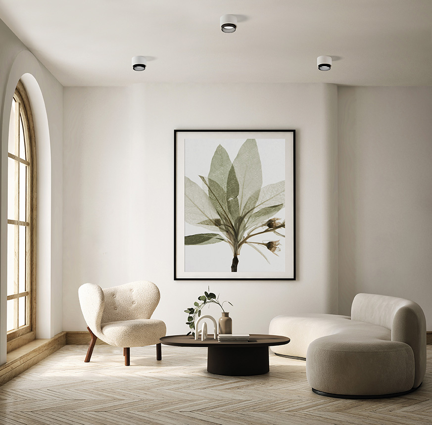 Plaster ceiling lamp with black painted aluminium ring. Equipped GX53 lamp holder.
