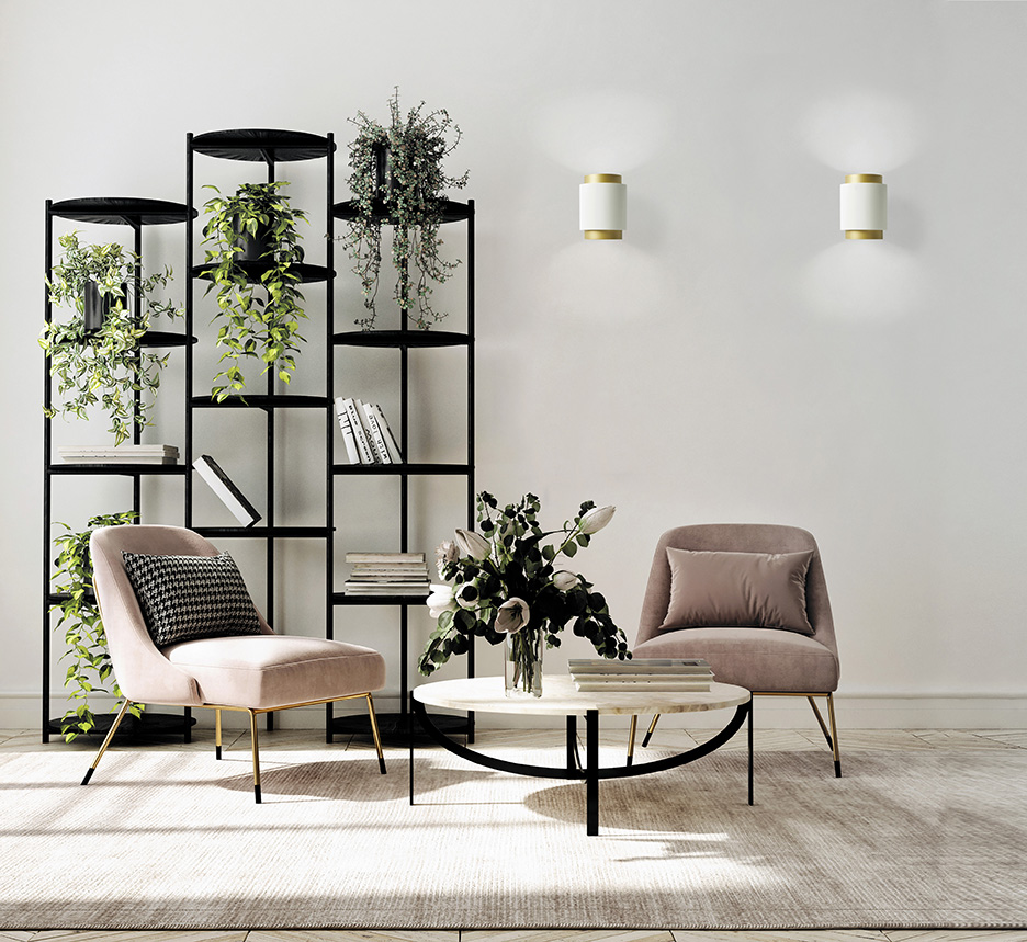 Plaster wall lamp. Brushed brass aluminium ring. Equipped GX53 lamp holder.