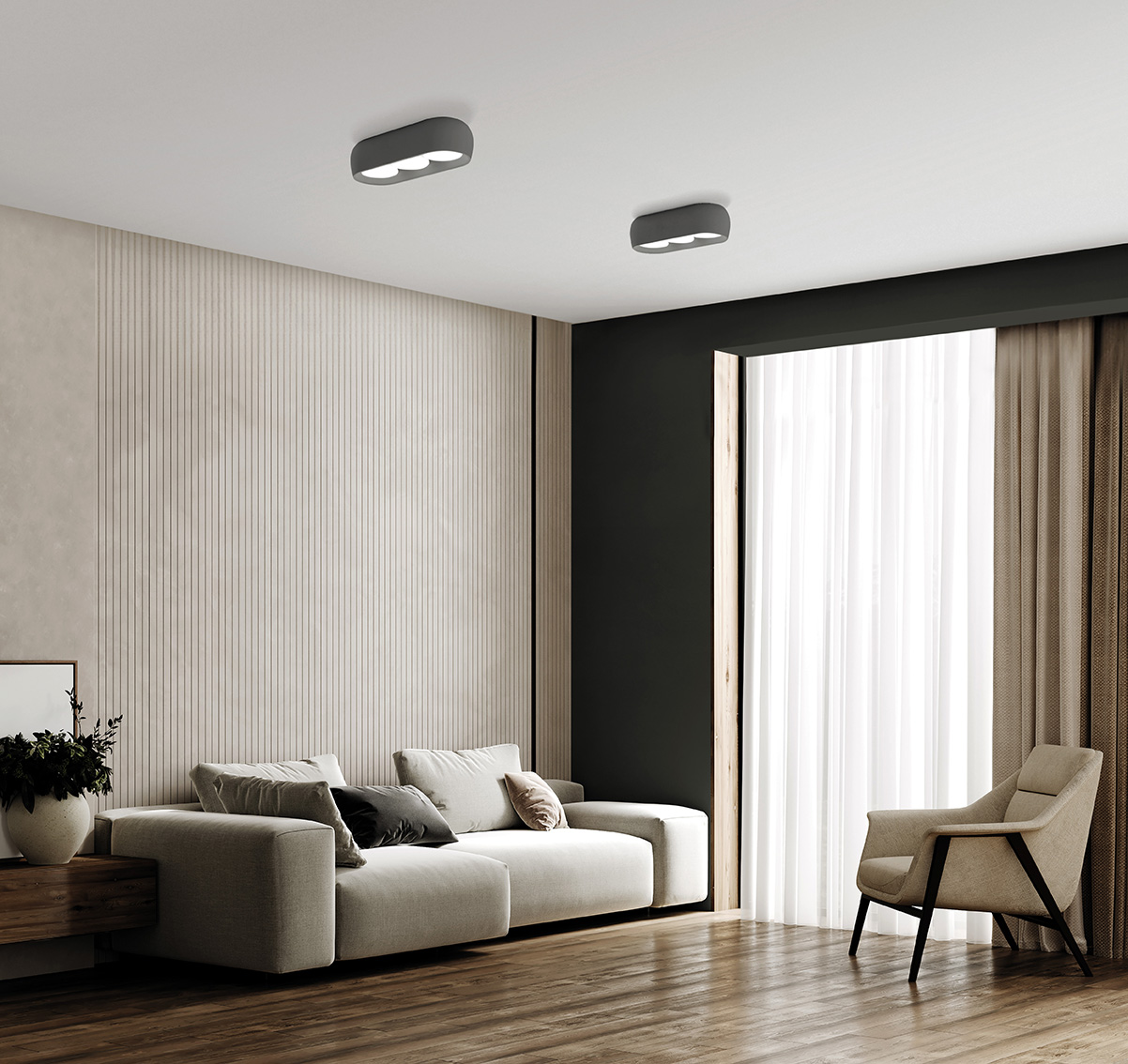 Plaster ceiling lamp in Quartz Grey (RAL7039). Equipped with 3 x GX53 lamp holders.