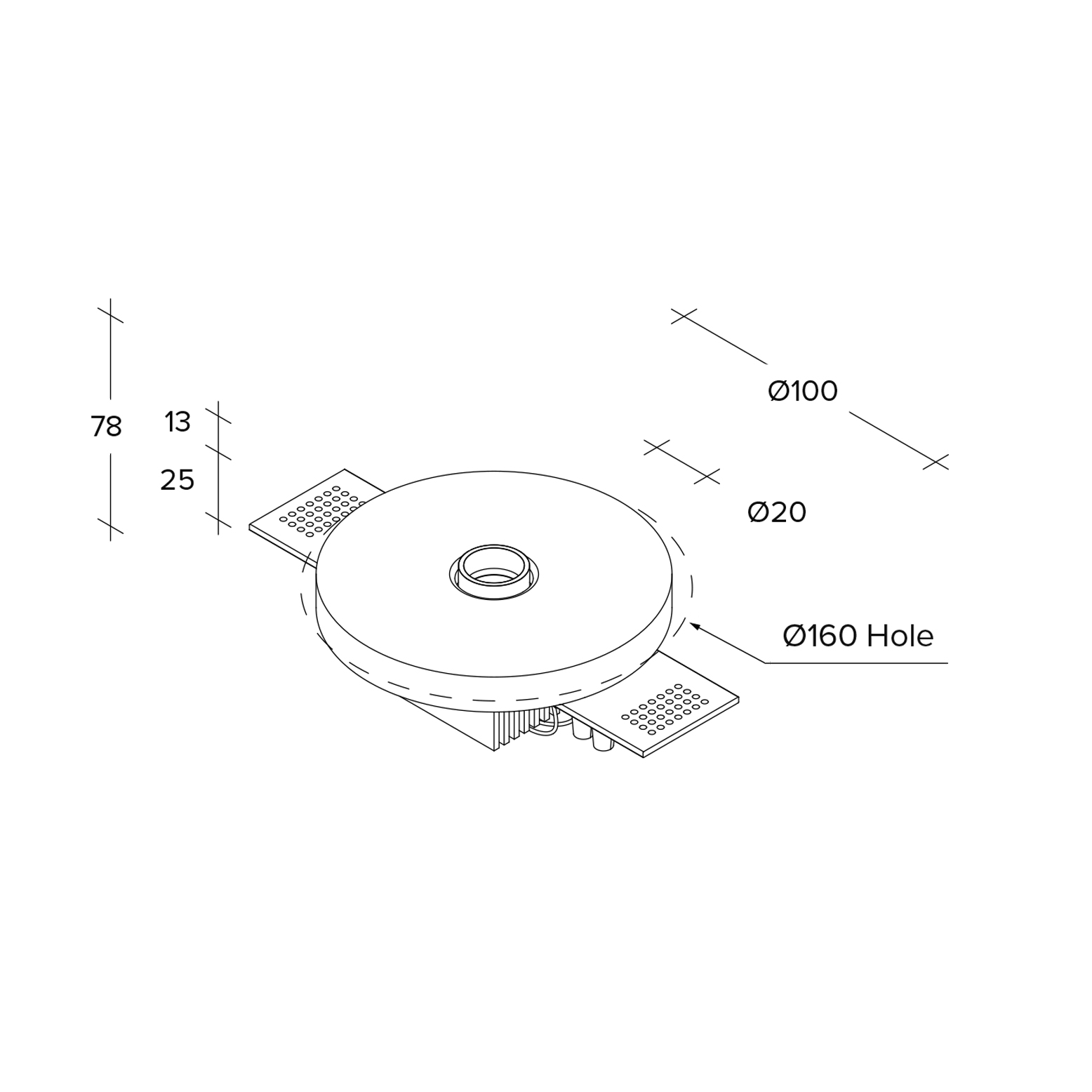Recessed plaster spotlight with painted white aluminium ring. Light element diameter 20 mm with integrated Triac dimmer LED module. Power supply included, to be remote cabled. Once smoothed over, the spotlight – that can be installed in the plasterboard, blends into the structure.
