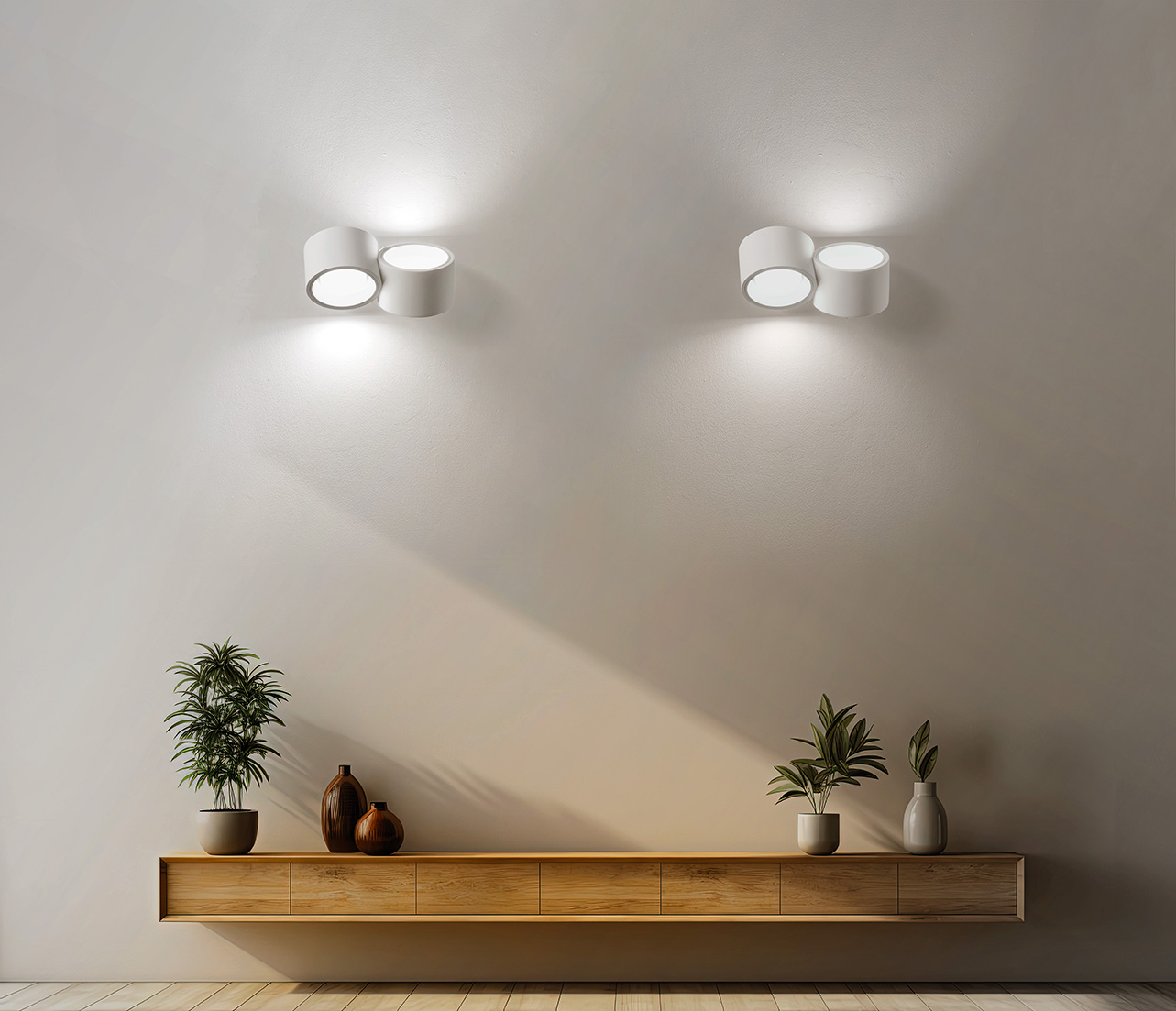 Lampada da parete in gesso per illuminazione indiretta. Anelli in alluminio verniciato bianco opaco. Dotata di due portalampada GX53