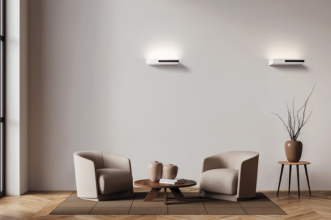 Lampada da parete in gesso per illuminazione indiretta. Elemento in alluminio con finitura nera. Dotata di tre portalampada GX53