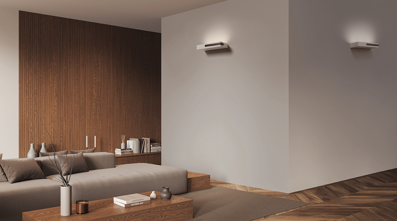 Lampada da parete in gesso per illuminazione indiretta. Elemento in alluminio con finitura bronzo spazzolato. Dotata di tre portalampada GX53