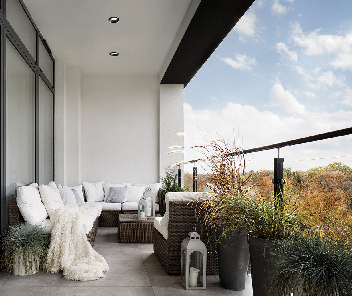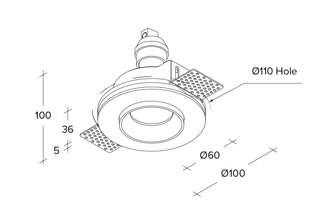 Faretto da incasso in gesso con anello metallico verniciato nero opaco a filo muro. Portalampada GU10. Il faretto, installabile nel cartongesso, una volta rasato risulta parte unica con la struttura. Grado di protezione IP54.